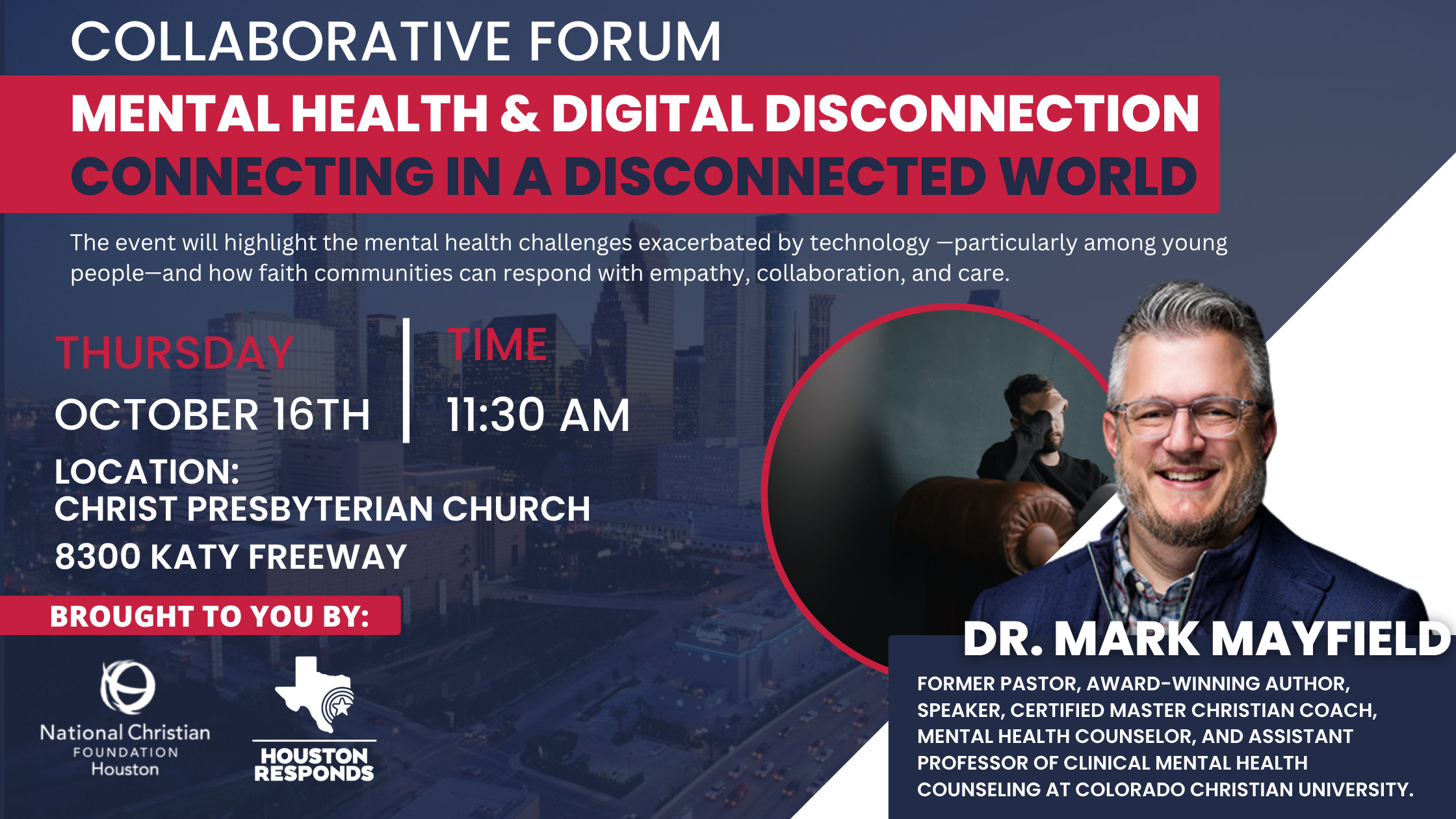Mental health issues in our city are a significant concern that deserves increased attention and support. The city's diverse population faces a range of mental health challenges, from anxiety and depression to more severe conditions, often exacerbated by socioeconomic disparities, access to care, and other stressors. Houston has made strides in community-based mental health initiatives, increased awareness, and the expansion of mental health care facilities. However, the demand for services continues to outstrip available resources. Churches play a key role alongside mental health professionals in helping people thrive emotionally and socially as they pursue spiritual maturity. Join us for a conversation among mental health professionals, counselors, and churches who are engaging these issues in their communities.